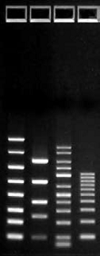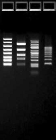 From left to right: FlashGel® DNA Marker 100 bp – 4 kb, FlashGel® QuantLadder, Lonza Marker 50 bp – 2,500 bp, Lonza 100 bp Ladder.