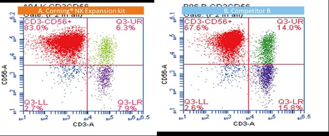 圖3. Corning培養基中獲得的NK細胞具有更高的CD3-CD56+陽性率 (83.0% vs 67.6%)。