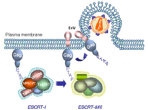 圖注:HIV-1通過(guò)其Gag蛋白的PTAP基序進(jìn)入細(xì)胞的蛋白質(zhì)轉(zhuǎn)運(yùn)系統(tǒng)ESCRT-I復(fù)合體,經(jīng)由ESCRT-II/III復(fù)合體逐步與細(xì)胞膜融合并釋放到細(xì)胞外,完成其復(fù)制周期并開始感染下一個(gè)細(xì)胞。出人意料的是,作為抗病毒干擾素信號(hào)通路上關(guān)鍵的激酶TBK1,還是ESCRT-I復(fù)合體的一個(gè)功能亞基,并可能通過(guò)磷酸化Vps37C而控制HIV-1病毒顆粒釋放到細(xì)胞外的速度。 |