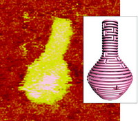 5年來,研究人員已經能夠制造出DNA納米結構,但大多數的形狀都相當乏味,例如盒子或多邊形,這是因為研究人員需要沿著DNA的格釘或“像素”進行折疊。 在4月14日發表于美國《科學》雜志網絡版上的一篇論文中,研究人員描述了一種新的折紙技術,即用不同半徑的DNA鏈形成的環形物。 研究人員將這些環形物堆疊起來,從而形成了基本的3維形狀,隨后嵌入“交叉點”使DNA鏈與毗鄰的環混為一體,最終將這一結構連在一起。 他們希望這個花瓶——上圖為一張原子力顯微圖像以及一張計算機生成圖像——能夠用于醫學研究,例如將藥物或酶投遞到身體的特定部位。 |