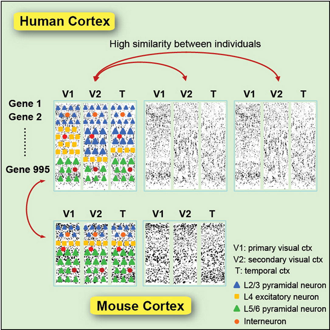 Allen腦科學研究所的科學家們通過分析大腦中大約1000個基因表達,發現了人類和小鼠大腦區域之間的相似之處和差異。相關研究成果在線發表在Cell雜志上。 這項研究揭示了人類個體之間的相似程度高。在三個特定區域的研究顯示近1000個基因中只有5%在人與人之間有表達差異。此外,通過Allen老鼠大腦圖譜數據集的比較,發現人類和小鼠之間有很大的一致性,人類視覺皮層與老鼠有79%的基因表達是相似的。
