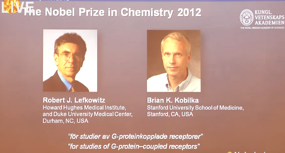 2012諾貝爾化學獎授予給 Robert J. Lefkowitz 與 Brian K. Kobilka。獲獎理由為“ G蛋白偶聯受體上的成就”。G蛋白偶聯受體在基礎科學和應用科學研究而言當然是比較重要的,特別是藥物發現方面,30%的藥物是靶向這些蛋白的。