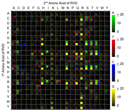 顯示TALE RVDs (Repeat-Variable Diresidues) 識別DNA堿基偏好性的熱圖 TALE (Transcription activator-like effector)是由多種黃單胞菌屬(Xanthomonas)細(xì)菌產(chǎn)生的用于激活宿主基因表達(dá)的第三類分泌蛋白。 自從2009年science同時發(fā)表了兩篇破譯TALE蛋白特異識別DNA堿基序列密碼的論文之后,TALE 的人工改造成為研究熱點,被迅速用于真核基因的定點修飾中;特別是TALE核酸酶(TALENs)的發(fā)明,使得真核基因的高效定點敲除在多種高等生物中得以實現(xiàn)。 然而,TALE識別DNA的常用密碼來自于25個天然存在的編碼序列,其強(qiáng)度和特異性還存在不足。雖然理論上存在400種可能的編碼情況,但由于人工組裝TALE蛋白序列有較高的技術(shù)難度,人們對其他潛在密碼識別DNA堿基的偏好性仍然一無所知。 魏文勝實驗室利用自主研發(fā)的高效TALE蛋白組裝技術(shù)(ULtiMATE system)以及全新文庫構(gòu)建方法成功建立了涵蓋所有編碼可能性的TALE蛋白評估系統(tǒng),并由此獲得了全部TALE重復(fù)單元識別DNA堿基的信息。 研究結(jié)果不僅驗證了已經(jīng)發(fā)表的密碼特性,還增添了DNA序列識別的新成員以及簡并密碼,特別是發(fā)現(xiàn)了能夠更加特異地高效識別鳥嘌呤的新型雙氨基酸密碼。本研究對TALE重復(fù)單元識別DNA堿基的規(guī)律認(rèn)識以及對堿基識別的多樣性拓展,對基因定點修飾技術(shù)在生物工程以及精確制導(dǎo)的基因治療方面具有重要意義。 這項工作已于2月11日在線發(fā)表于《細(xì)胞研究》(Complete decoding of TAL effectors for DNA recognition),其共同第一作者為北大生命科學(xué)學(xué)院魏文勝實驗室的博士研究生楊君嬌和張媛。該項目得到了國家重點基礎(chǔ)研究發(fā)展計劃、國家自然科學(xué)基金和北大清華生命科學(xué)聯(lián)合中心的支持。