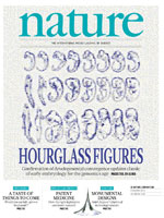 相關物種中胚胎的出現在發育過程中途發生融合,之后又分開,這個現象被稱為“發育沙漏”。沙漏模型由Karl Ernst von Baer建立在經典觀察結果之上,后來由Ernst Haeckel(達爾文在德國的支持者)廣泛普及。但這種所謂的系統發生階段是否真的存在?兩個研究小組利用對比方法對這個模型進行了驗證,并為其提供了支持。在該系統發生階段所表達的基因在演化上比在其他階段所表達的基因更古老、更保守。本期封面為Haeckel在1879年根據果蠅胚胎形成過程中的表達模式的數千幅圖像畫出的一幅圖。