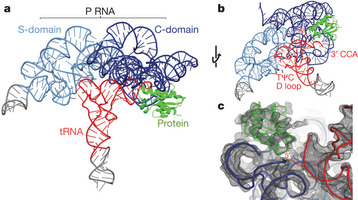 轉移RNA(tRNA)是作為前體合成的,這些前體要求在5? 和3?端進修剪并對特定核苷酸進行一些修飾。Ribozyme RNase P普遍對處理tRNA的5?端負責。現在,與成熟苯基丙氨酸轉移RNA 結合在一起的RNase P(來自Thermotoga maritima)的晶體結構已被確定。該結構顯示了在pre-tRNA識別中所涉及的相互作用、活性點位置及催化中金屬的作用。RNase P/tRNA核糖核蛋白結構也為一個基于RNA的古老世界是怎樣演化為當今由蛋白-催化劑支配的世界的提供了線索。