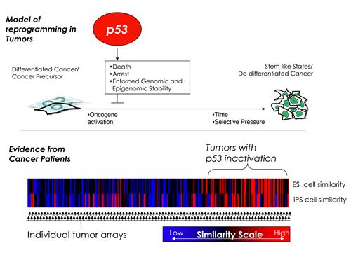 p53是人類重要的腫瘤抑制基因,正常p53的生物功能好似“基因組衛(wèi)士(Guardian of the Genome)”,在G1期檢查DNA損傷點(diǎn),監(jiān)視基因組的完整性。當(dāng)基因組遭受損傷時(shí),p53蛋白可阻止DNA復(fù)制,以提供足夠的時(shí)間使損傷DNA修復(fù);如果修復(fù)失敗,p53蛋白則會(huì)引發(fā)細(xì)胞凋亡。當(dāng)p53基因的兩個(gè)拷貝都發(fā)生突變時(shí),細(xì)胞的增殖會(huì)失去控制,從而導(dǎo)致細(xì)胞癌變。 近日來(lái)自薩克生物研究學(xué)院和普林斯頓大學(xué)高級(jí)研究所的研究人員在共同合作的一項(xiàng)研究中發(fā)現(xiàn)p53還可抑制癌細(xì)胞向更富于侵襲性的干細(xì)胞樣狀態(tài)轉(zhuǎn)化。研究人員根據(jù)p53的這個(gè)新功能將其稱之為“防止基因組重編程的衛(wèi)士(Guardian against Genome Reprogramming)”。研究論文發(fā)表在本周的 PNAS 雜志上。 “眾所周知,低分化、細(xì)胞及遺傳異質(zhì)性是許多侵襲性和致死性癌癥的重要特征,”薩克生物研究所基因表達(dá)實(shí)驗(yàn)室的Wahl教授說(shuō)道:“最近有科學(xué)家提出這些特征是由于存在干細(xì)胞樣癌細(xì)胞所致。我們的發(fā)現(xiàn)表明p53突變可使腫瘤細(xì)胞重新獲得干細(xì)胞樣‘編程’。” “癌細(xì)胞需要獲得干細(xì)胞的某些特征例如永生性才能生存和適應(yīng)不斷變化的環(huán)境。永生能力使得細(xì)胞能夠不斷自我更新,并能生成可分化為其他細(xì)胞類型的祖細(xì)胞,”Wahl說(shuō):“所有的腫瘤都是由癌細(xì)胞組成的不同的細(xì)胞聚集物,然而目前我們尚無(wú)法了解腫瘤異質(zhì)性形成的機(jī)制。” 過(guò)去科學(xué)家們將腫瘤的細(xì)胞多樣性主要?dú)w因于其具有遺傳不穩(wěn)定性。隨著腫瘤細(xì)胞群擴(kuò)增,個(gè)別細(xì)胞發(fā)生隨機(jī)突變,細(xì)胞的分子特性開(kāi)始出現(xiàn)差異,最終由成百萬(wàn)的各不相同的癌細(xì)胞共同構(gòu)成了腫瘤。 此外一些科學(xué)家們還認(rèn)為腫瘤的異質(zhì)性是由于完全定型和特化的細(xì)胞在腫瘤發(fā)生和發(fā)展的過(guò)程中發(fā)生了去分化所造成的。然而最終這一理論被丟棄,取而代之的當(dāng)前流行的癌干細(xì)胞理論。癌干細(xì)胞理論認(rèn)為腫瘤中存在一類重要的細(xì)胞即癌干細(xì)胞。這些癌干細(xì)胞有可能起源于正常干細(xì)胞或早期祖細(xì)胞,與其他腫瘤細(xì)胞不同它們具有自我更新的能力并可像正常干細(xì)胞一樣生成非干細(xì)胞。 “我們的研究結(jié)果表明與干細(xì)胞相似的癌細(xì)胞并不是早期腫瘤的組成部分,而是在腫瘤發(fā)生的后期隨著p53功能的喪失才出現(xiàn)的,“論文的共同作者、博士后研究人員Benjamin T. Spike說(shuō):“腫瘤異質(zhì)性有可能是由于不斷增長(zhǎng)的基因組不穩(wěn)定性和與干細(xì)胞樣表型相關(guān)的表觀遺傳不穩(wěn)定性共同作用所致。” 在新研究中研究人員證實(shí)p53不止發(fā)揮了“基因組衛(wèi)士”的功能,這個(gè)腫瘤抑制因子同時(shí)還是阻斷體細(xì)胞重編程的一個(gè)重要障礙。