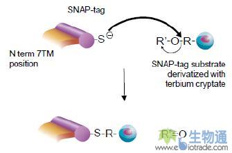 圖1: GPCR-SNAP與Tb穴狀化合物結合。表達在GPCR N端的SNAP與底物-Tb的芐甲基反應。