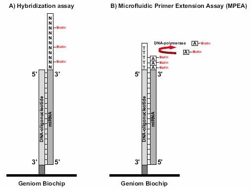MPEA相對于現有的其它微陣列方法,顯示出突出優勢。由于miRNA不需經過富集、PCR擴增或標記等預處理而直接導入,這樣就確保避免了實驗誤差的產生(見圖, A為常規雜交方法,B為微流引物延伸)。傳統的雜交檢測最適合鑒別雜交靶點中心位點上的錯配,相比之下,MPEA提供了更高水平的靈敏度,由于酶催化的延伸僅在3’末端幾乎完全配對時才會發生,因此很少會出現交叉雜交信號。與傳統的RNA-預處理,Klenow延伸列陣檢測(RAKE)相比,MPEA也顯示出幾點主要優勢(Nelson et al., 2004)。RAKE微數列通過與其相應的寡核苷酸的5' 末端結合于表面,而MPEA陣列的寡聚核苷酸捕獲探針與其3' 末端相連。MPEA的這種結合方式不僅排除了探針的自身延長,尤其重要的是說明這種延長作用遠離微通道管腔表面而沒有任何位阻。由于微流體通道的使用,也大大降低了所需RNA樣本量。MPEA具有高度的靈敏性,無需擴增,就足以檢測出來源于福爾馬林固定樣本,組織針孔吸取樣本或激光捕獲顯微分離樣本的納克級的總RNA。 |