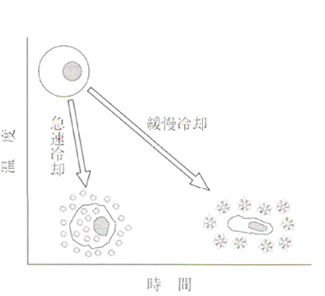 上世紀50-70年代Basil Luyet,James Lovelock,Peter Mazur等學者針對冷凍對細胞和組織的影響展開深入研究,發現損傷主要來源于冰晶損傷和溶液滲透壓損傷。隨著溫度的下降,細胞內外的水分結冰,所形成的冰晶會造成細胞膜和細胞壁破壞,從而導致細胞死亡。這種因細胞內部結冰而引起的細胞損傷即冰晶損傷(Intracellular ice damage)。冰晶損傷是由冷卻速度過快造成,冷卻速度越快,冰晶損傷越大。同時隨著溫度的下降,細胞外部的水分會先結冰,從而使得未結冰的溶液中電解質濃度升高,細胞膜上的脂質會因長時問暴露在高溶質的溶液中而受到損壞,細胞發生脫水滲漏,導致在復溫時大量水分滲入細胞內造成細胞死亡。這種因保存溶液溶質濃度增高而形成的細胞損傷被稱為溶液損傷(Solution damage)。溶液損傷是由冷卻速度過慢,使細胞在高濃度的溶液中暴露的時間過長而造成,冷卻速度越慢,此損傷越嚴重。 程序降溫/分步降溫(programmed freezing/stepwise freezing)