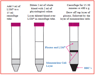 大部分的紅細(xì)胞和粒細(xì)胞通過梯度遷移形成顆粒狀。由于其密度不同,淋巴細(xì)胞和其他單個(gè)核細(xì)胞(單核細(xì)胞和血小板)分布在血漿和LSM兩層中間。淋巴細(xì)胞可以通過回抽分層回收,在進(jìn)一步去除血小板,LSM和血漿。