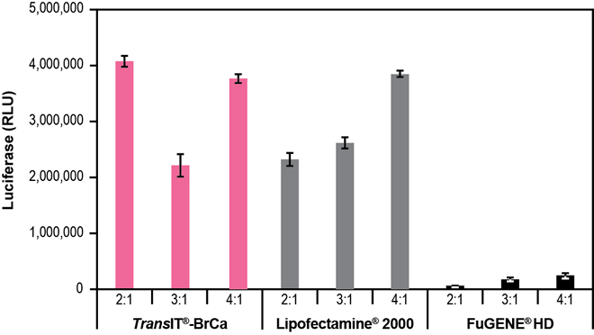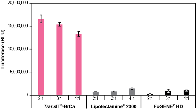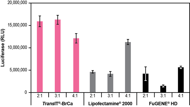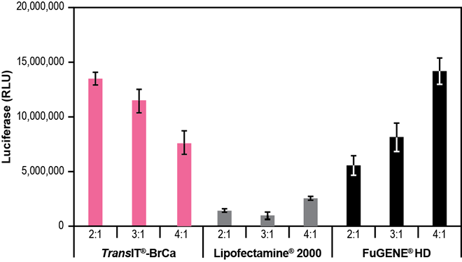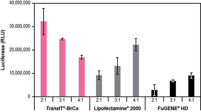 圖 1 TransIT®--BrCa 轉(zhuǎn)染試劑產(chǎn)生高效質(zhì)粒 DNA 轉(zhuǎn)染。