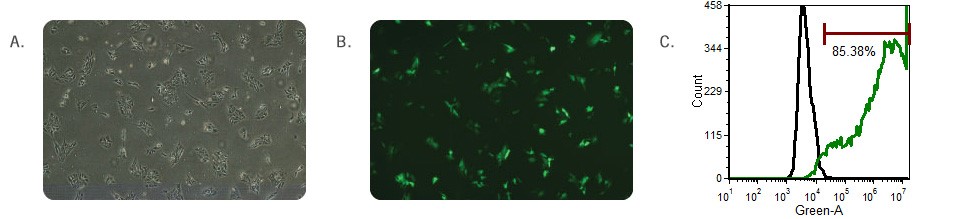 Ingenio® 電穿孔試劑盒用于在 Amaxa®Nucleofector® 裝置上轉染 2 x 106 個 iPS 細胞。用 8 μl 表達 ZsGreen 的質粒 (Clontech) 在 100 μl 中電穿孔細胞,并以 0.33 x 106 個細胞/孔接種在 6 孔板中。轉染 24 小時后,用 Olympus IX71® 倒置顯微鏡觀察細胞并在 4 倍物鏡下成像。圖像為 (A) 相襯,(B) 綠色熒光。轉染 24 小時后,使用 Accuri® 細胞儀檢測細胞。直方圖 (C) 顯示與使用 Ingenio®Electroporation Kit(綠線)的質粒電穿孔的細胞相比,未電穿孔的細胞(黑線)。