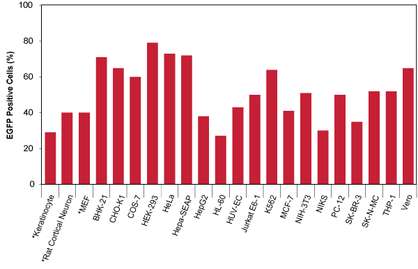 Ingenio® 溶液為 Amaxa® Nucleofector® 設備提供了可比的效率。