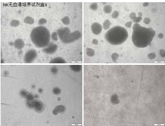 圖1. 培養10天后NK細胞的形態。培養于NK無血清培養試劑盒II、NK培養試劑盒、競爭產品I和競爭產品Y10天后的NK細胞。以上為隨機選擇的照片。比例尺:200 µm。