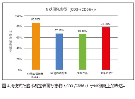 NK細胞的特異表面標志物為CD3-/CD56+。流式細胞的分析結果 顯示使用NK無血清培養試劑盒II可獲得86.7%的NK陽性細胞,而使用競爭產品I和競爭產品Y的培養試劑盒則獲得相對較少的NK 陽性細胞(分別為66.1%和78.8%),數據如圖4所示。